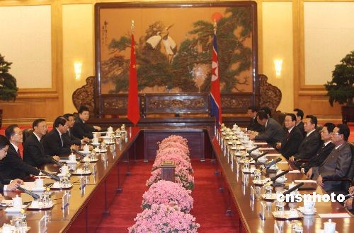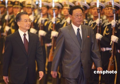 3月18日下午,中国总理温家宝在北京人民大会堂举行仪式,欢迎朝鲜民主主义人民共和国内阁总理金英日访华。中新社发 任晨鸣 摄