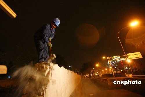 3月20日23时左右,长安街道路大修工程正式启动。据悉,这是十余年来长安街首次大修,预计8月30日完工。伴随此次道路大修,将同步进行交通工程、绿化整治和公交优化,并对建国门立交桥进行桥面翻新和结构加固,对沿线多处地下通道出入口进行延长调整,实现长安街复兴门至建国门路段五上五下双向十车道的规划。为最大限度减少施工对城市交通及市民的影响,施工主要集中在夜间进行,白天交通不受影响。中新社发 富田 摄