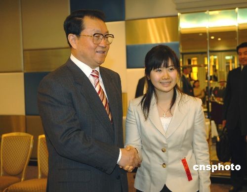 3月31日上午,正在日本进行正式友好访问的中共中央政治局常委李长春在东京会见了部分日本友好人士代表。图为李长春与日本著名乒乓球运动员福原爱亲切握手。中新社发 朱沿华 摄