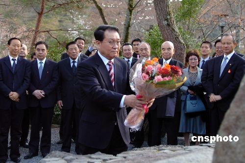 4月2日下午,正在日本进行正式友好访问的中共中央政治局常委李长春前往京都岚山瞻仰周恩来总理诗碑。图为李长春向诗碑敬献花束。中新社发 朱沿华 摄