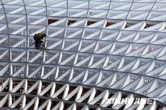 近日,上海世博会阳光谷加快建设,开始安装幕墙玻璃。阳光谷是上海2010年世博会的最大单体工程,采用钢结构形式,让自然光透过幕墙倾泻而下,满足部分地下空间的采光,体现环保节约的理念。