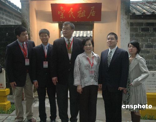 宋氏家族三代后人四月七日在海南文昌故居寻根问祖.这是宋氏家族七十三年来首次回乡。图为美国斯坦福大学胡佛总统研究所访问学者、宋子安次子宋仲虎的妻子宋曹琍璇(右三)和她的女儿宋元慈(右一)、儿子宋元孝(右二),宋子文长女宋琼颐的儿子冯英祥(左三)及其两位儿子冯永康(左一)、冯永健(左二)等六位宋氏后人在故居前合影。中新社发 王辛莉 摄