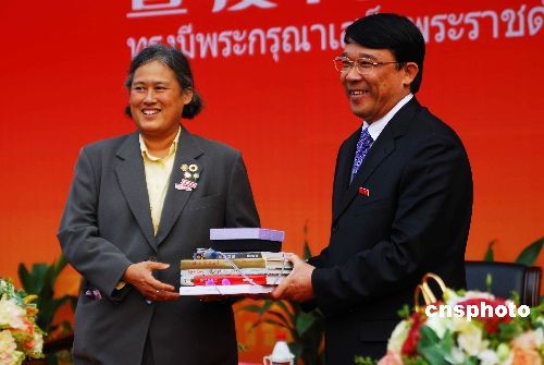 4月7日,泰王国玛哈扎克里·诗琳通公主殿下和厦门大学党委书记朱之文互赠礼品。当日,玛哈扎克里·诗琳通公主殿下出席厦门大学泰国文化节开幕式。此次厦门大学泰国文化是厦门大学建校88周年纪念的系列活动之一,旨在促进中泰文化友好交流。玛哈扎克里·诗琳通公主殿下在开幕式上用中文致辞,对中泰文化交流予以积极的肯定。中新社发 周运杰 摄