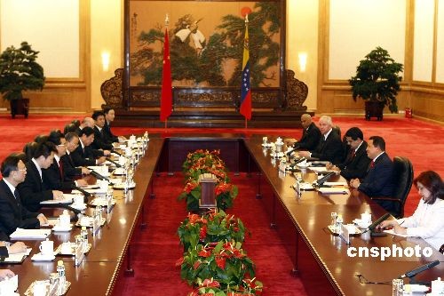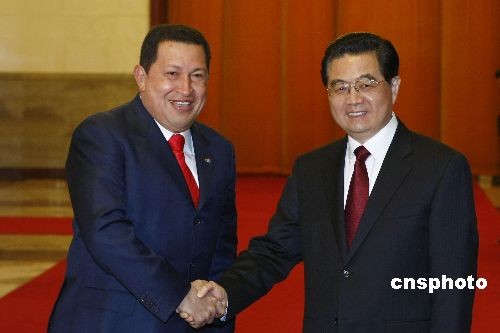4月8日,中国国家主席胡锦涛在北京人民大会堂会见到访的委内瑞拉总统查韦斯。中新社发 盛佳鹏 摄