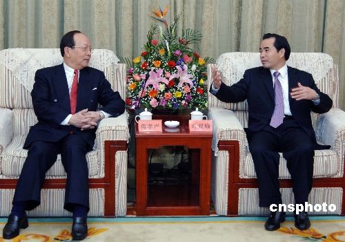 4月9日,中共福建省副省长叶双瑜(右)在漳州会见专程前来参加第十三届漳台经贸恳谈会暨首届海峡两岸(福建漳州)农产品交易会开幕式的中国国民党副主席蒋孝严(左)一行。中新社发 刘可耕 摄