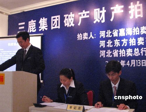 4月13日,由河北省嘉海拍卖有限公司作为主拍单位,与河北省东方拍卖有限公司、河北省拍卖总行有限公司共同进行拍卖三鹿集团部分资产。当日拍卖的11项破产财产,竞买人显然无意出手,其中天津三鹿乳业51%的股权竟叫出20万元的起拍价,最终也无人问津,三鹿集团第4批破产财产全部流拍。中新社发 翟羽佳 摄