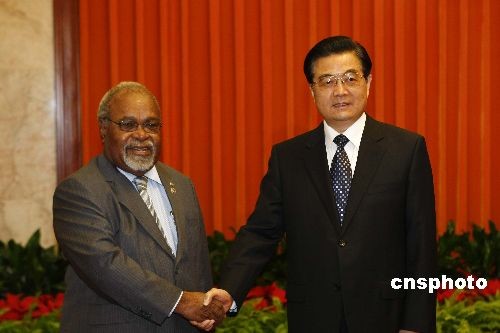 4月14日,中国国家主席胡锦涛在北京人民大会堂会见巴布亚新几内亚总理索马雷。中新社发 盛佳鹏 摄