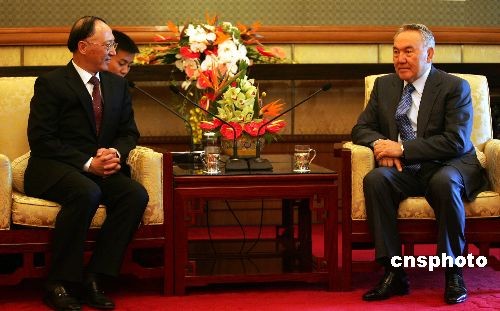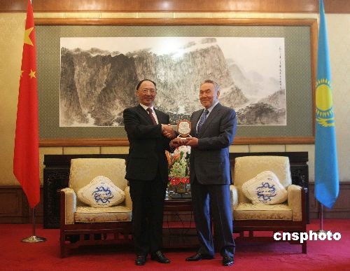 4月16日,中国国家体育总局局长、中国奥委会主席刘鹏在北京钓鱼台国宾馆会见哈萨克斯坦总统纳扎尔巴耶夫,并向纳扎尔巴耶夫总统颁发中国奥委会勋章,以表示其对中国体育事业的支持。纳扎尔巴耶夫此行是应中国国家主席胡锦涛邀请,于15日傍晚抵达北京,开始对中国进行为期5天的国事访问。访华期间,纳扎尔巴耶夫将与中国国家主席胡锦涛、全国人大常委会委员长吴邦国和国务院总理温家宝进行会见,他还将出席博鳌亚洲论坛2009年年会,这是纳扎尔巴耶夫2005年连任总统以来第2次对中国进行国事访问。中新社发 富田 摄