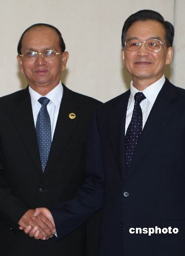 4月17日下午,海南省三亚市亚龙湾海滨喜来登酒店,中国国务院总理温家宝会见前来出席“博鳌亚洲论坛2009年会”的缅甸总理登盛。中新社发 任晨鸣 摄