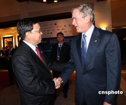 美国前总统小布什四月十七日晚抵达海南博鳌,参加博鳌亚洲论坛年会,并将作主题演讲。图为论坛秘书长龙永图十七日晚在博鳌酒店迎接小布什。中新社发 谢南健 摄