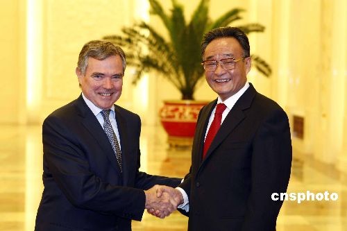4月20日,中国全国人大常委会委员长吴邦国在北京人民大会堂会见法国国民议会议长阿克耶。中新社发 盛佳鹏 摄