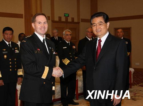 4月23日上午,国家主席、中央军委主席胡锦涛在青岛会见应邀前来参加中国人民解放军海军成立60周年庆典活动的29国海军代表团团长,代表中国政府和军队向参加庆典活动的各国海军官兵表示热烈欢迎。王建民摄