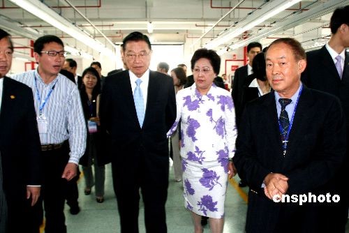 四月二十七日下午,海基会董事长江丙坤一行在海协会副会长郑立中、李炳才陪同下,抵达扬州参访位于扬州经济开发区的台资企业宝宏制鞋公司参观。中新社发 崔佳明 摄