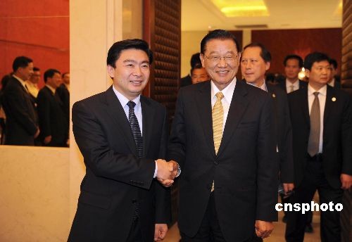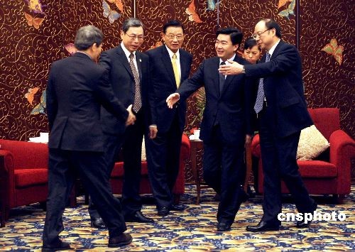 四月二十八日,中共苏州市委书记王荣在苏州会见台湾海基会董事长江丙坤一行。中新社发 廖攀 摄