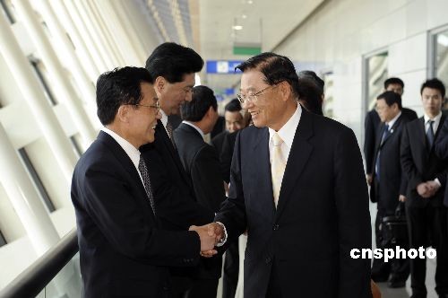 四月二十九日,海协会副会长李炳才在上海浦东机场,为台湾海基会董事长江丙坤(前右)送行。中新社发 廖攀 摄