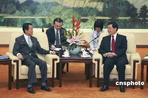 4月30日,中国国家主席胡锦涛在北京人民大会堂会见日本首相麻生太郎。中新社发 盛佳鹏 摄