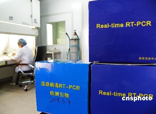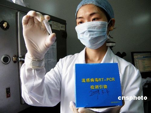 2009年5月5日,湖北省宜昌市疾病预防控制中心国家级流感网络实验室内,工作人员在展示和预实验甲型H1N1流感病毒快速诊断试剂。甲型H1N1流感病毒快速诊断试剂由中国疾病预防控制中心和中国医学科学院研制,可以在12小时内检测出样本是否携带甲型H1N1流感病毒。据悉,甲型H1N1流感病毒快速诊断试剂已于2009年5月4日配发到中国84个流感网络实验室。中新社发 刘君凤 摄