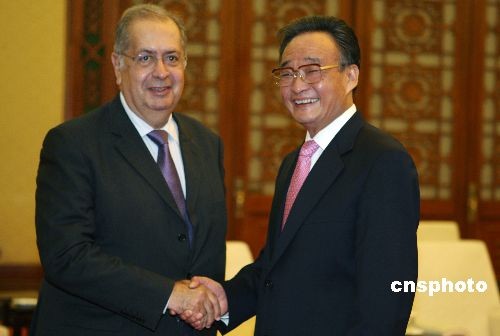 5月6日下午,中国全国人大常委会委员长吴邦国在北京人民大会堂会见葡萄牙议长雅伊梅·伽马。中新社发 任晨鸣 摄