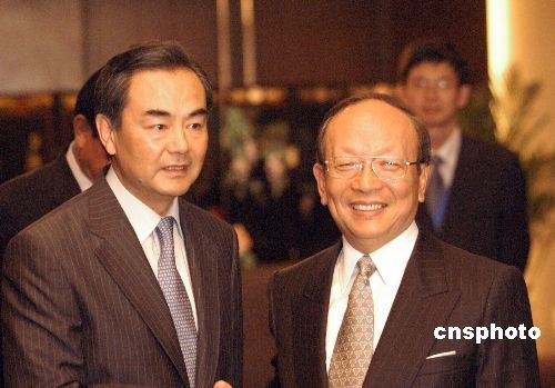 第六届湖北·武汉台湾周将于5月8日在武汉开幕。图为5月7日晚,国台办主任王毅在武汉会见了应邀出席该活动的中国国民党副主席蒋孝严,海协会会长陈云林等陪同会见。中新社发 艾启平 摄