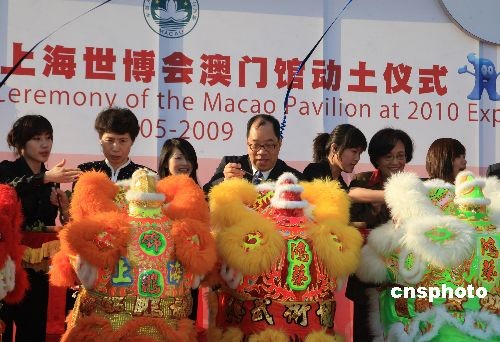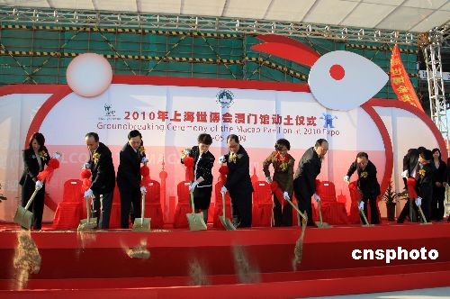 5月8日,2010年上海世博会澳门馆举行动土仪式。澳门特别行政区经济财政司司长谭伯源、中央人民政府驻澳门特别行政区联络办公室副主任高燕、上海世博会执行委员会专职副主任钟燕群等为仪式主礼,来自澳门的立法议员、人大代表、工商界以及国际商会代表等超过150人出席仪式。澳门馆─“玉兔宫灯”位于中国馆区,主体建筑高19.99米,寓意澳门回归的年份1999,别具意义。中新社发 潘索菲 摄