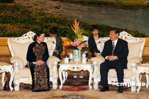 5月11日,中共中央政治局常委、国家副主席习近平在北京人民大会堂会见越共中央书记处书记、中央民运部部长何氏洁。中新社发 盛佳鹏 摄