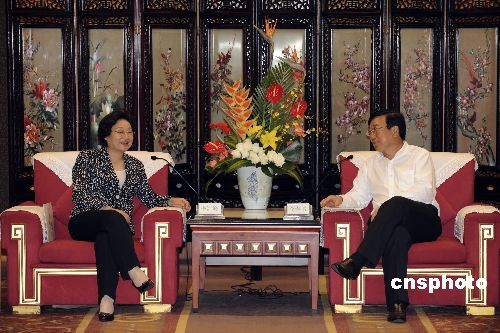 5月11日,中共成都市委书记李春城在成都会见国侨办主任李海峰及其率领的知名侨资企业家和海外华文媒体负责人一行。中新社发 廖攀 摄