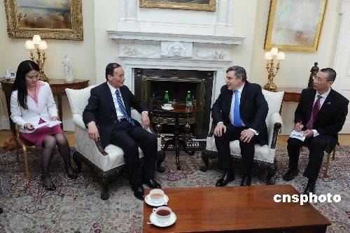 当地时间5月11日,英国首相布朗在伦敦唐宁街10号首相府会见中国国务院副总理王岐山。王岐山于5月8日至12日期间对英国进行访问,并与英国财政大臣达林共同主持了第二次中英经济财金对话。中新社发 魏群 摄