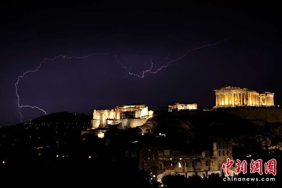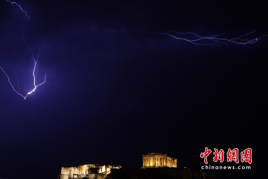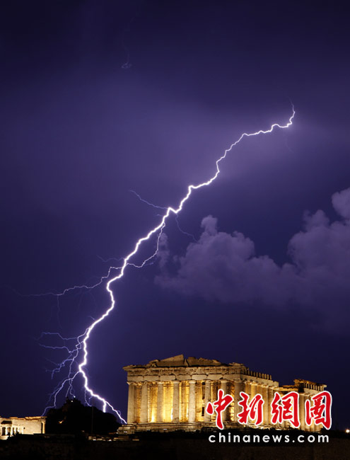 28日,在希腊雅典卫城的上空,一道巨型闪电向具有2500年历史的帕特农神庙劈来,幸好没有造成任何损失。