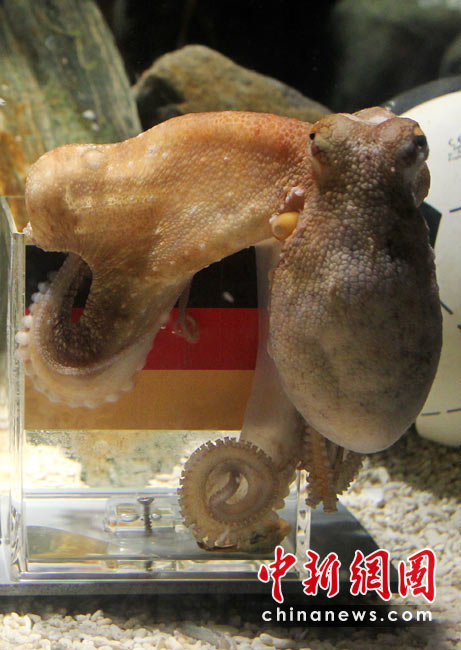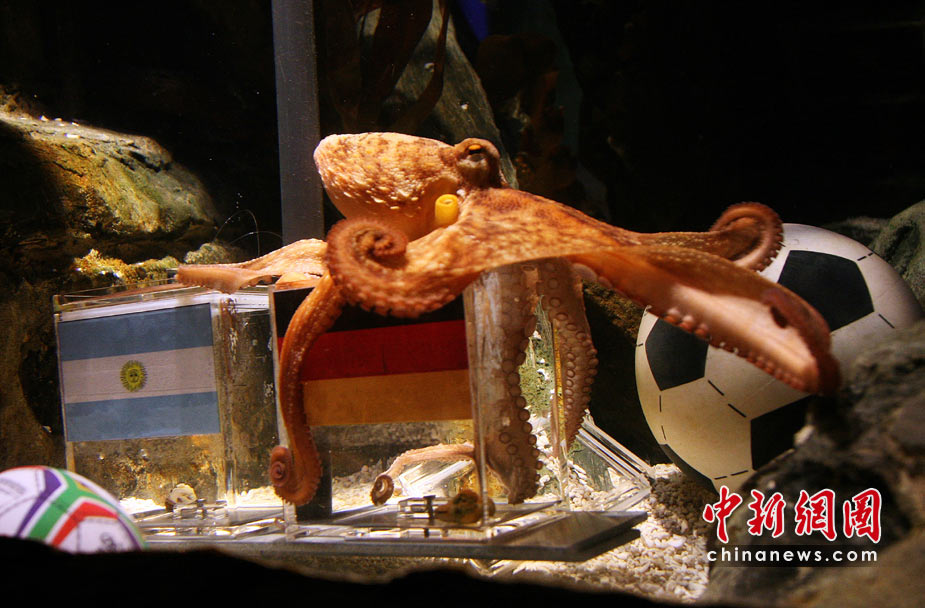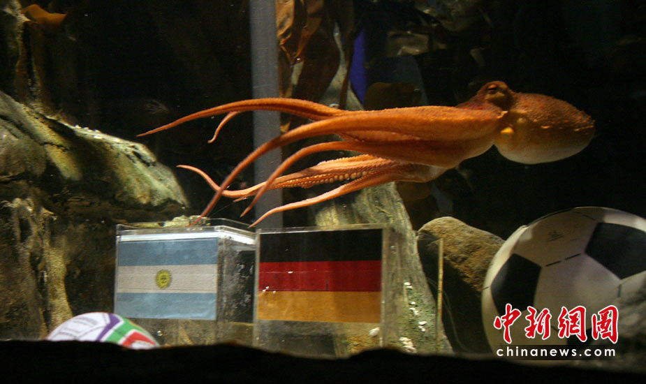 据悉,海洋馆员把分别印有德、阿旗帜的贝壳放入玻璃缸,与对英格兰队比赛前脆快取出德国那枚贝壳不同,章鱼“保罗”对德国和阿根廷的对决有些“犹豫不决”,“考虑了长达一小时”但是最终还是取出了印有德国旗帜的贝壳。