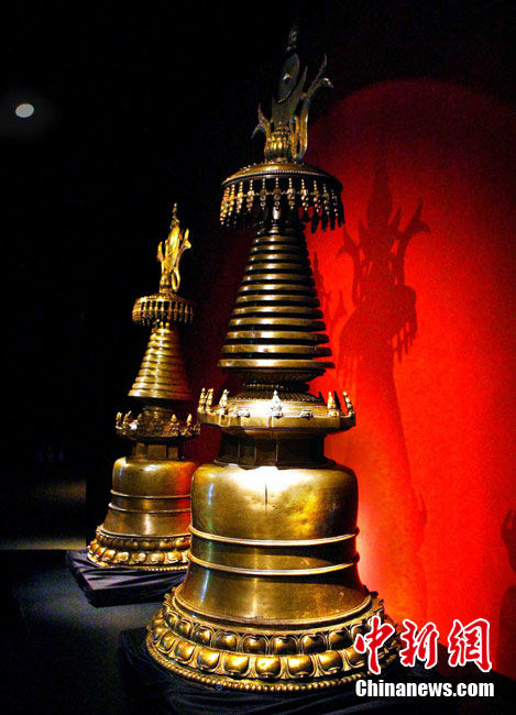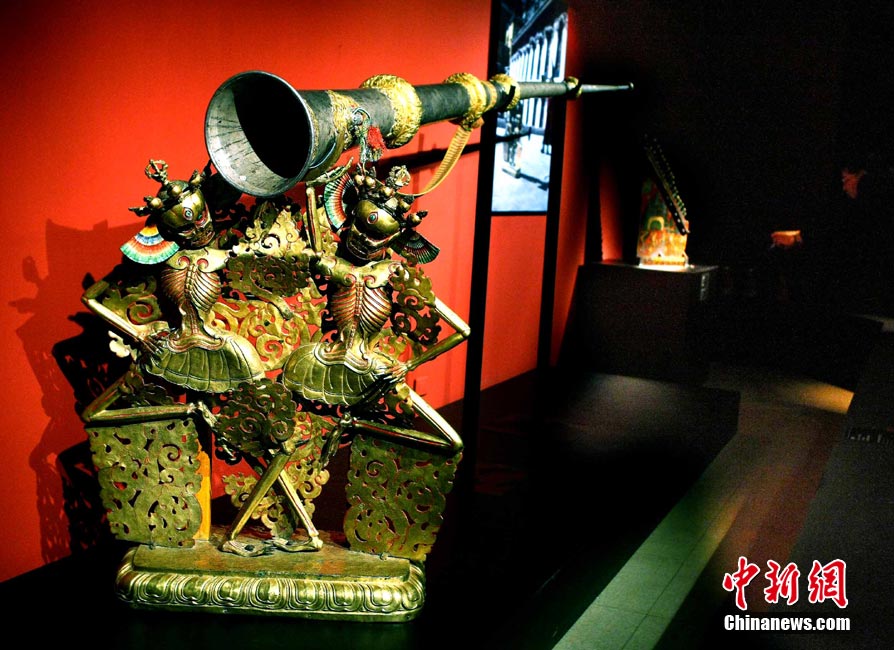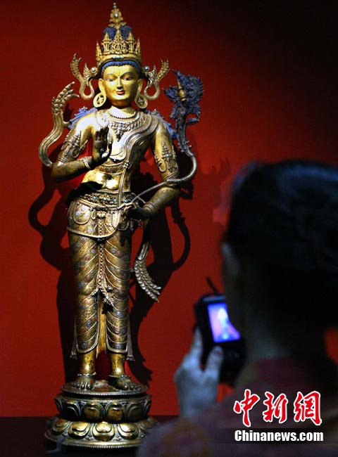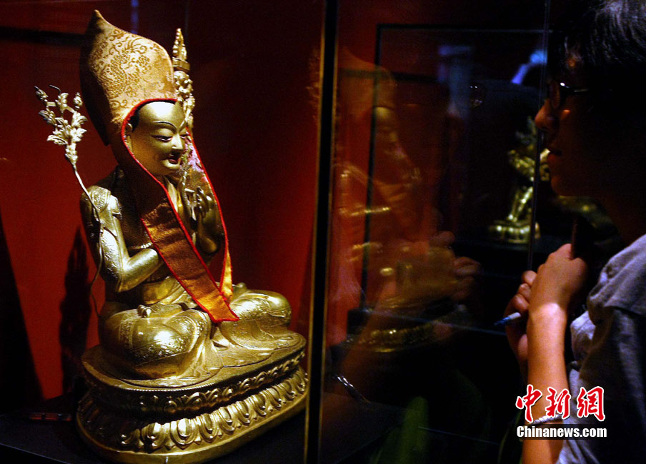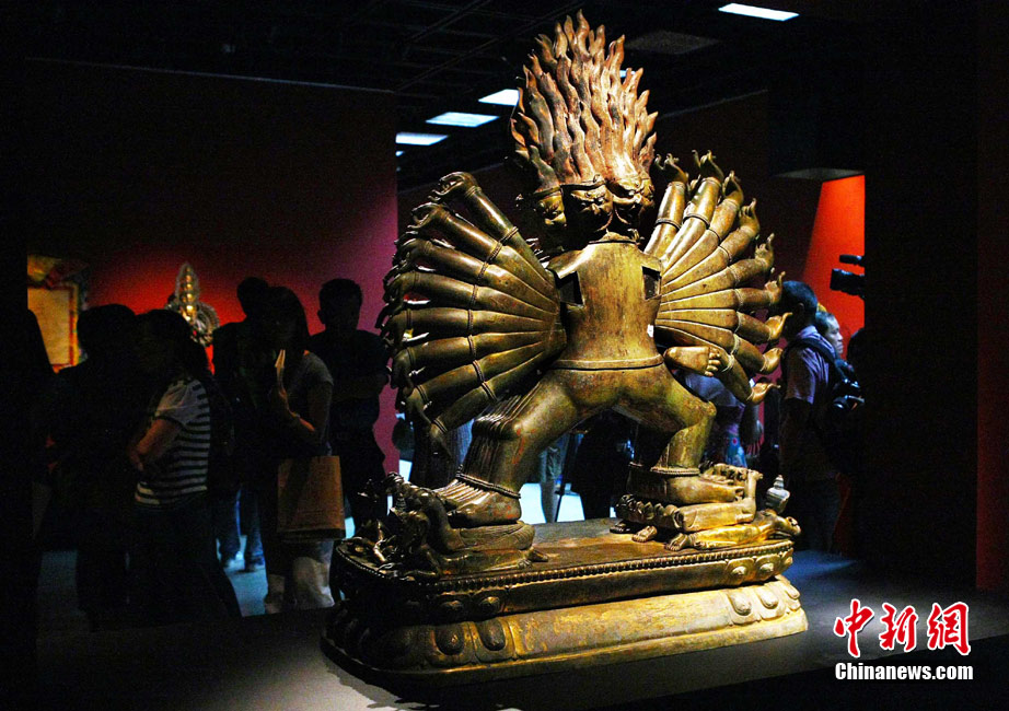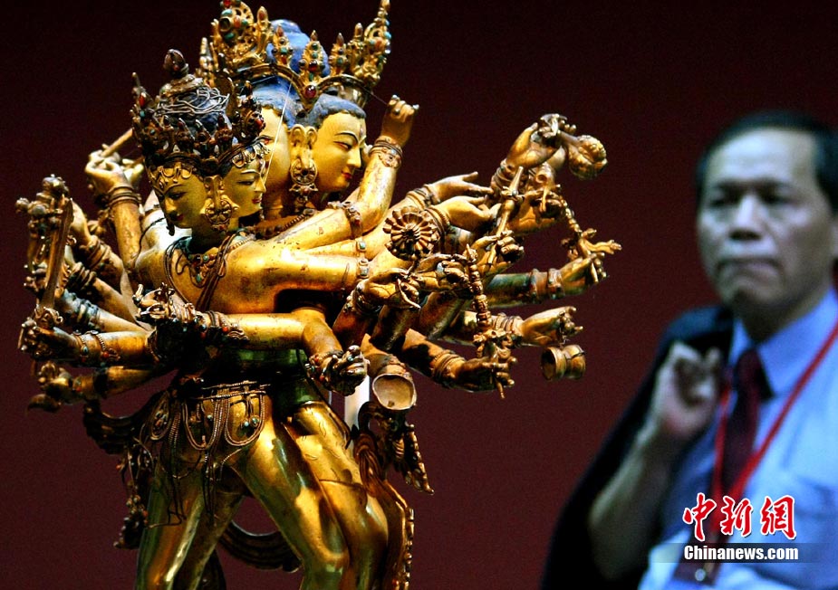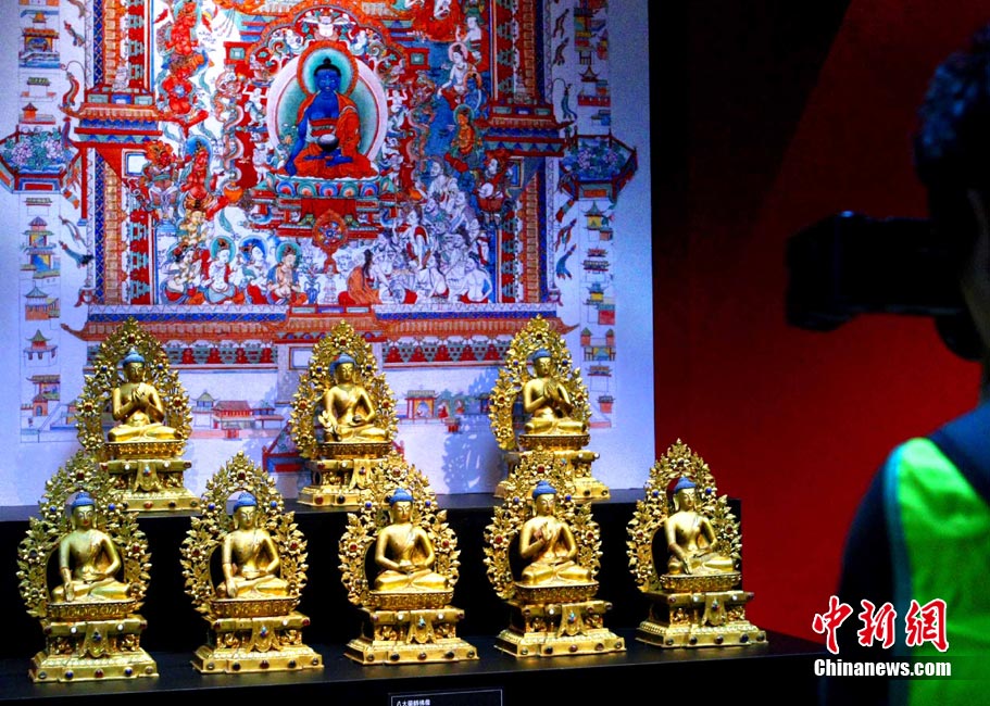 “圣地西藏---最接近天空的宝藏”特展,6月30日在台湾故宫博物院揭开面纱。这次展览是台湾历年来规格最高、面向最完整的西藏文化与文物展,展出的130组件文物,来自西藏布达拉宫、罗布林卡等寺庙、西藏博物馆、承德避暑山庄和北京民族文化宫等12处文物重镇。整个展览按“吐蕃王朝”、“金色宝藏”、“文化交流”、“雪域风情”四部分布局展出,展览9月19日结束。中新社记者 宋吉河摄