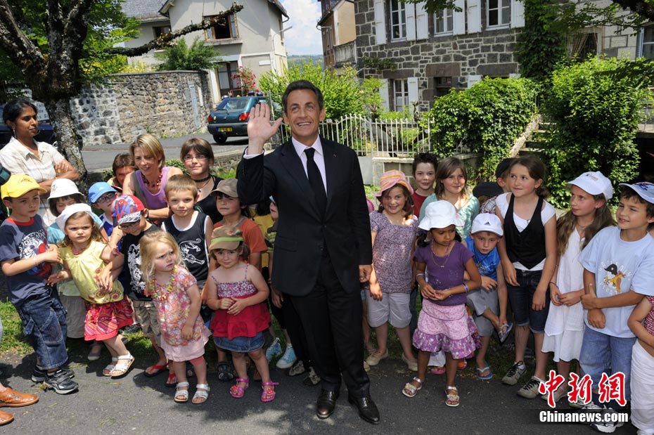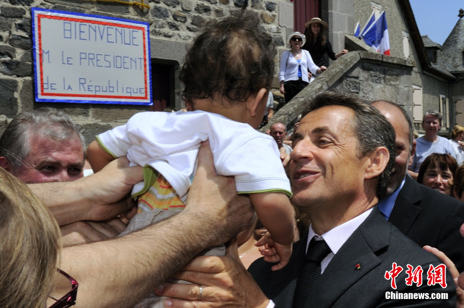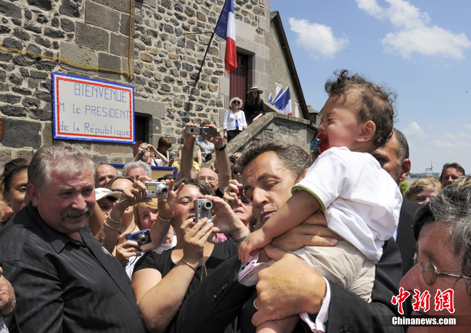 当地时间7月1日,法国总统萨科齐来到法中部城镇Mur-de-Barrez视察,与当地民众零距离接触.他从民众手中抱起一个叼着奶嘴的小婴儿,不知是何原因,小宝贝竟然大哭起来。