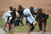 7月3日,代号“友谊—2010”的中国巴基斯坦反恐联合训练在中国宁夏青铜峡地区展开,此次训练主要以边境地区山地联合反恐作战为课题,分为展示交流、混编同训、综合演练三个阶段。图为中方反恐狙击手伪装秘密潜入实弹射击。 中新社发 杜洋 摄