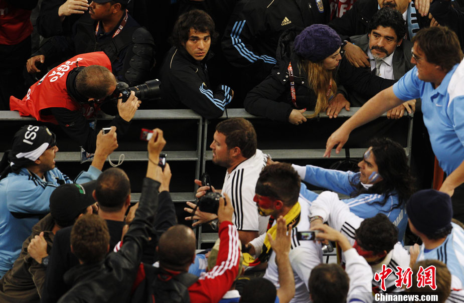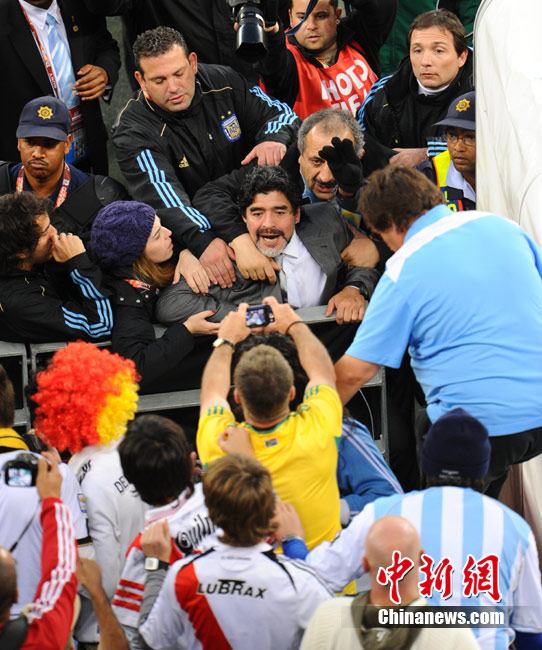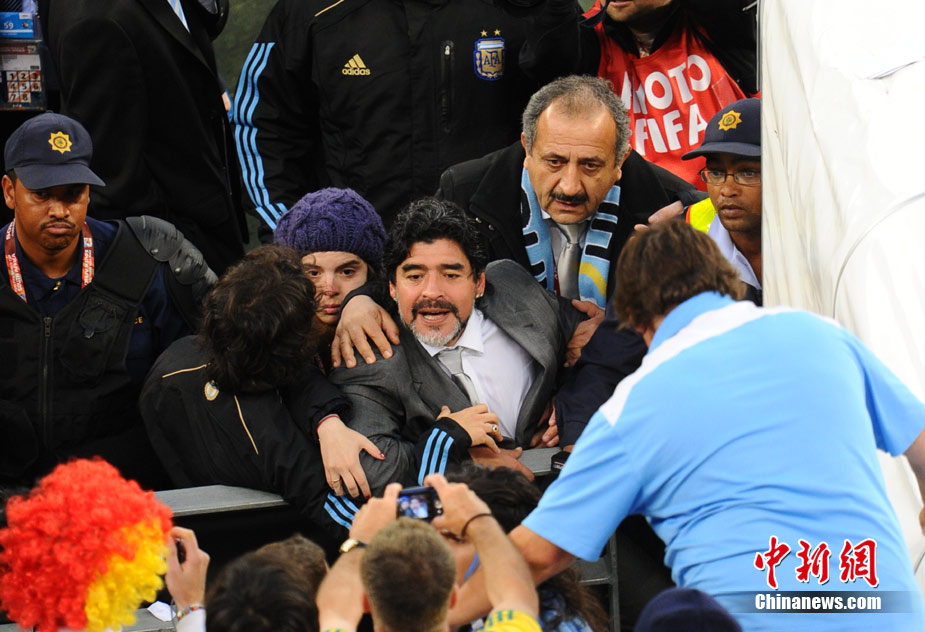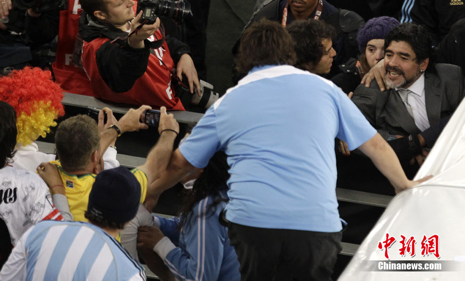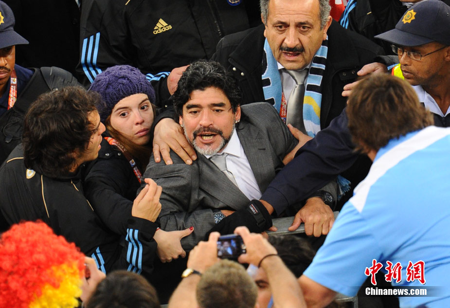 南非世界杯阿根廷与德国队的比赛结束后,疯狂的德国球迷对马拉多纳进行了辱骂和奚落,急脾气的老马转身冲向看台与球迷理论,他更是要爬上看台亲手教训这些球迷。好在大女儿达尔玛和阿根廷教练组成员及时前往制止,否则后果将不堪设想。