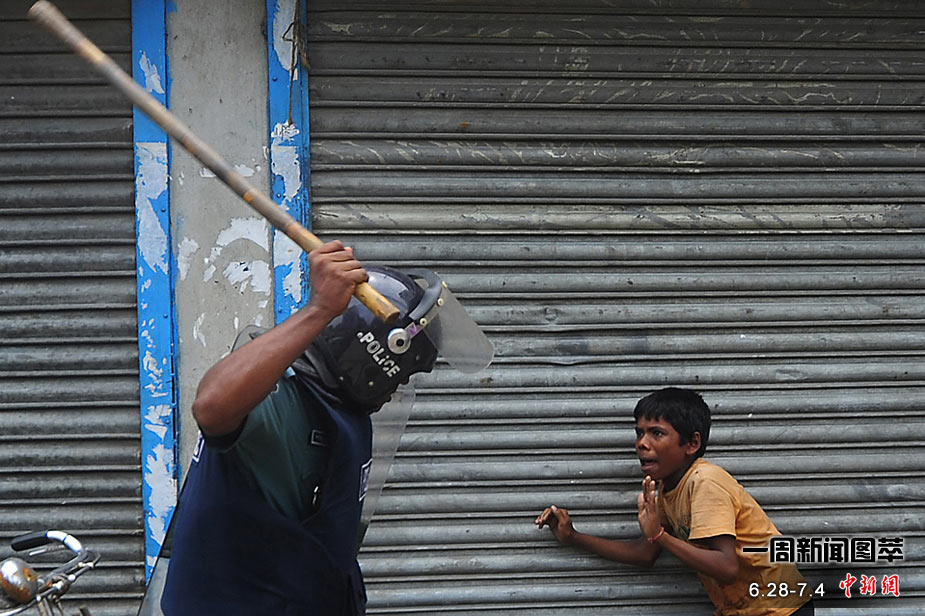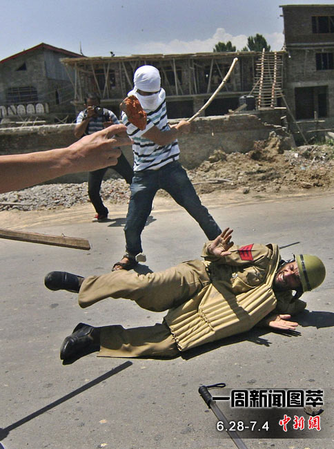28日(周一),在印控克什米尔地区首府斯利那加市郊,当地穆斯林在举行抗议活动时与警察发生冲突,两名穆斯林在冲突中丧生。图为警察在冲突中被打倒在地。