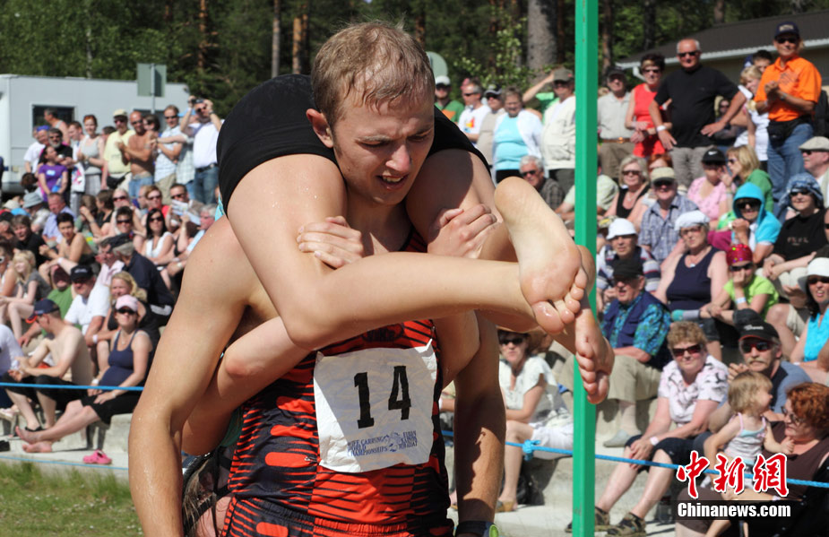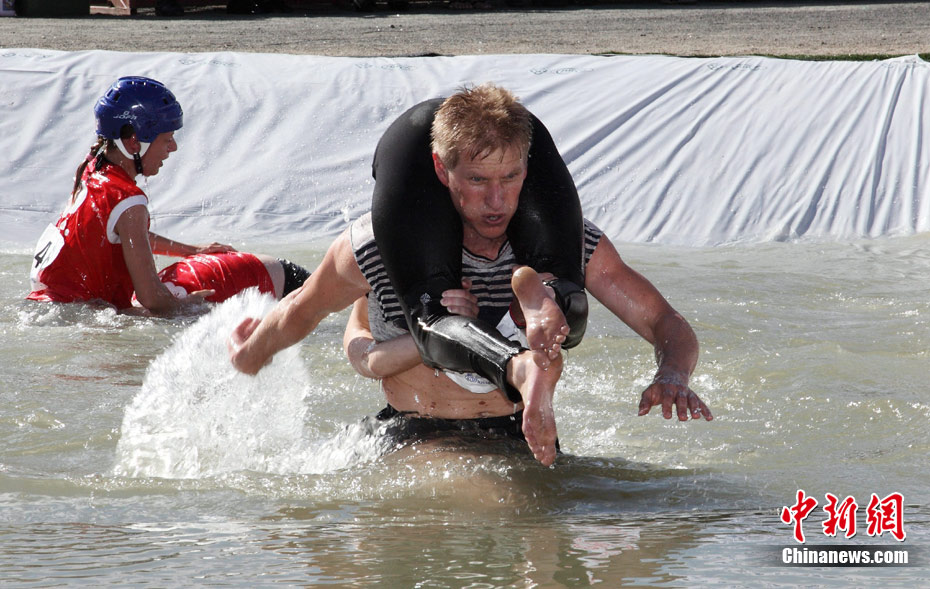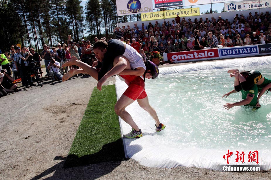 7月3日,一年的一度的世界背老婆大赛在芬兰中部小镇松卡耶尔维举行,参赛者背着自己的老婆在泳池里行走,最终来自芬兰的一对选手最先通过终点。