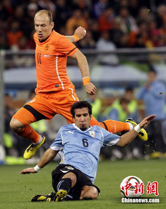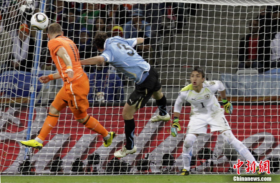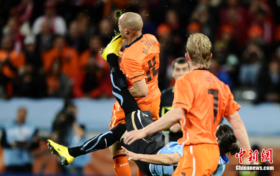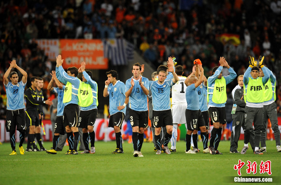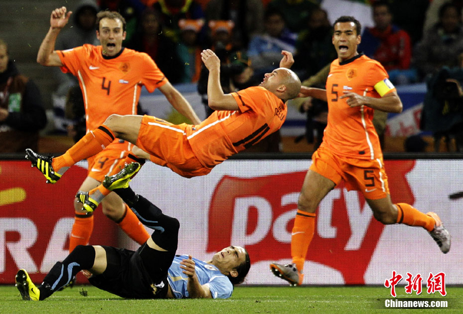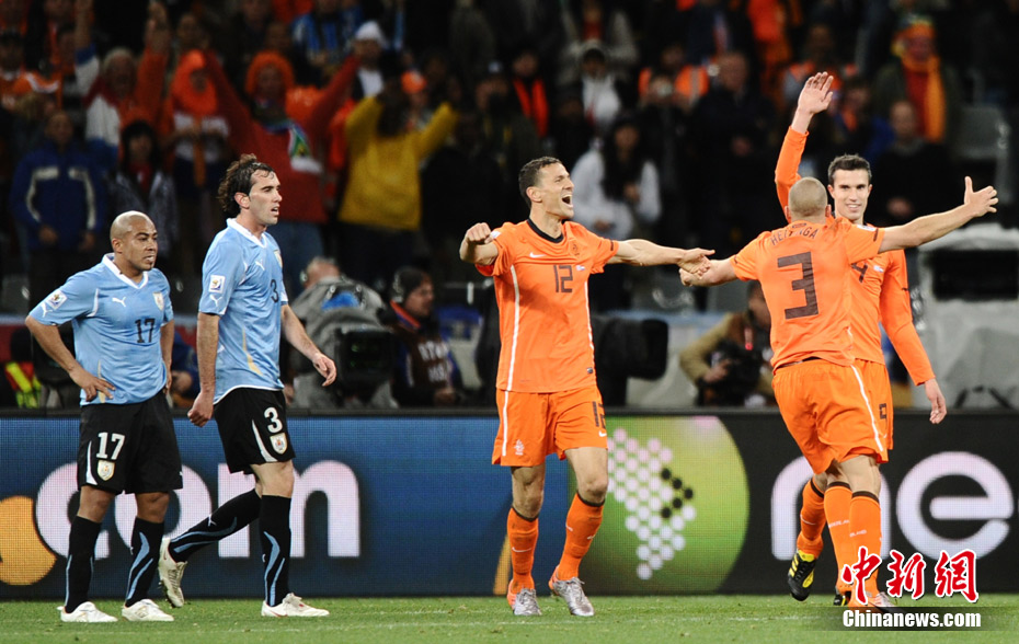 7月7日凌晨2:30,南非世界杯半决赛首场较量在开普敦绿点球场拉开战幕,由南美老牌劲旅乌拉圭迎战荷兰队。布隆克霍斯特远射先拔头筹,而弗兰也通过一记远射将比分扳平。下半场斯内德和罗本连续进球一度令荷兰队锁定胜局,然而补时阶段乌拉圭人的进球似乎又燃起了最后的希望,但荷兰队顶住了对手的疯狂进攻,3-2击败乌拉圭队,成功挺进决赛。