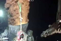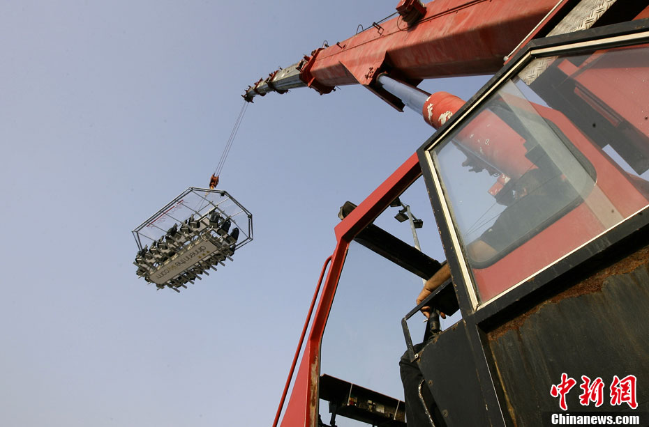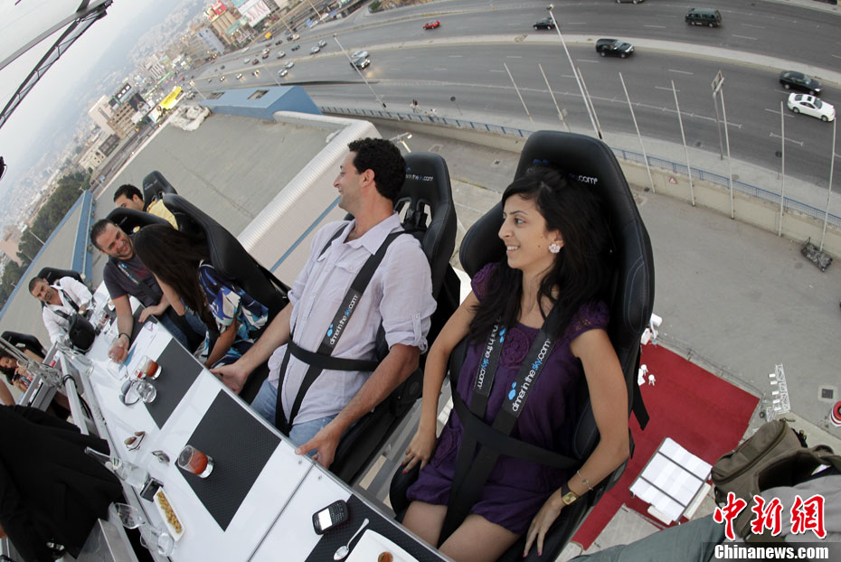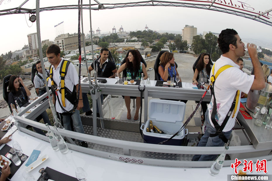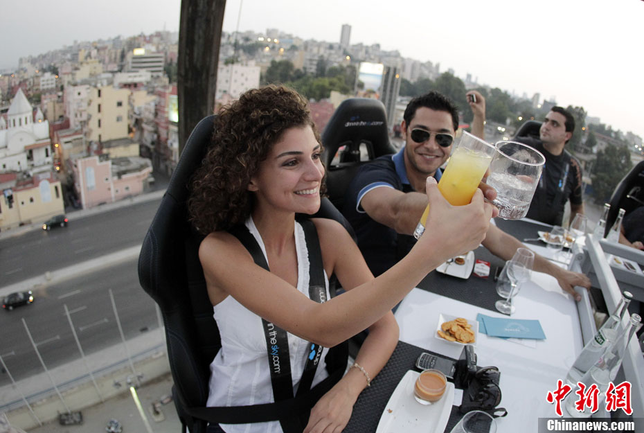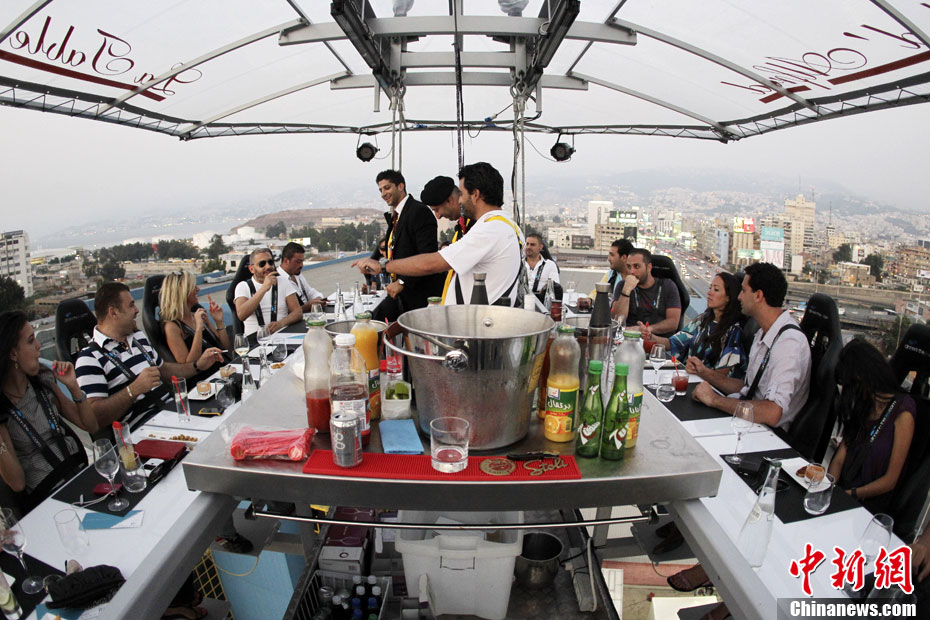 7月10日,黎巴嫩贝鲁特22名宾客围坐在被起重机吊起50米的餐桌旁享用“空中晚宴”。