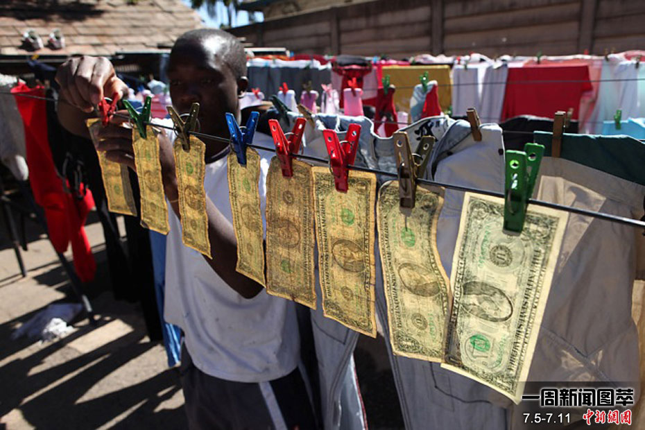 7月6日周二,津巴布韦哈拉雷,阿莱克斯•姆庞迪晾晒清洗过的美钞。据当地人说,这些美钞流通到本国时因异味太浓无法使用。去年津巴布韦政府宣布美元为法定货币。