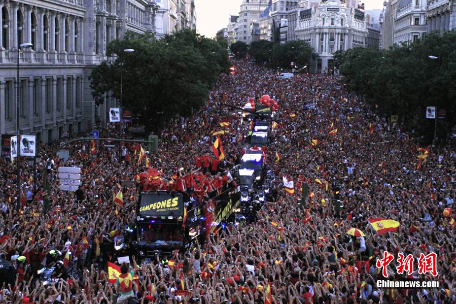 西班牙队凯旋归国 数万球迷游街迎英雄