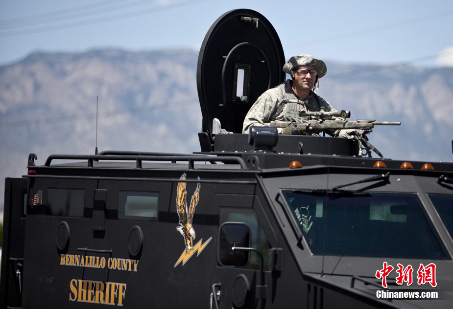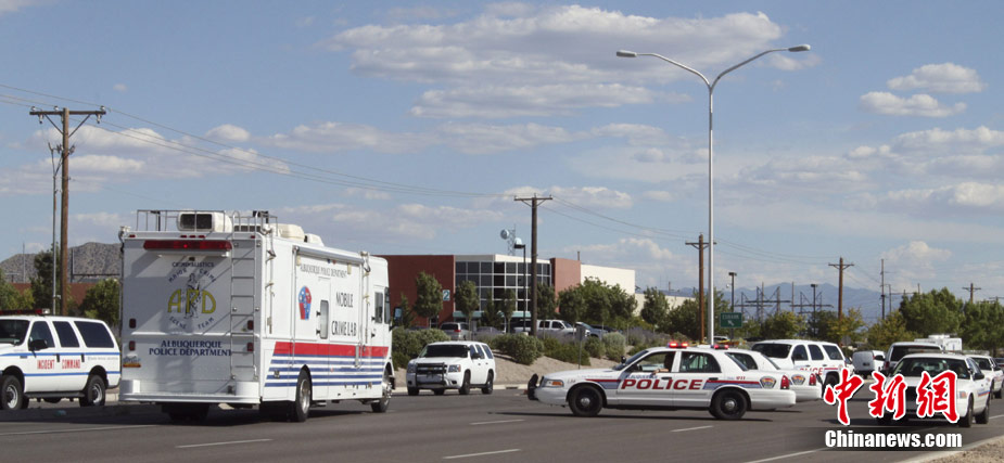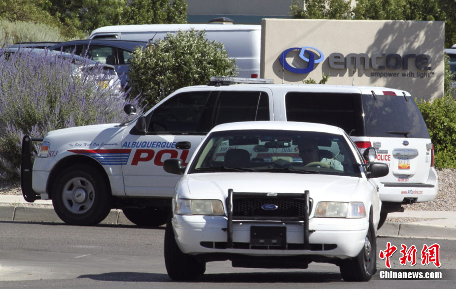 7月12日,美国新墨西哥州阿尔伯克基发生一起枪击案,一名枪手在阿尔伯克基东南部的一家光导纤维厂办公大楼会议室里开枪,打死2人,打伤4人,枪手随后自杀身亡。警方认为,这可能是一起由家庭纠纷引起、发展到工作场所的枪击事件。图为警察在办公大楼附近巡逻。