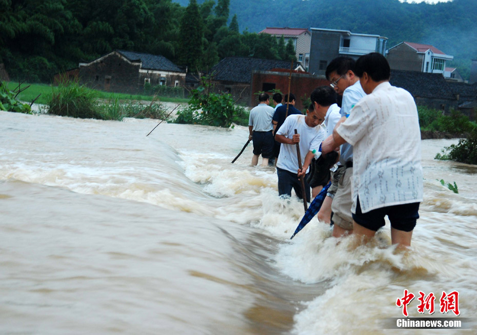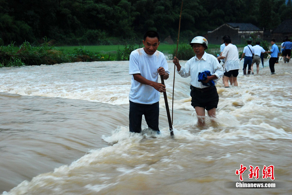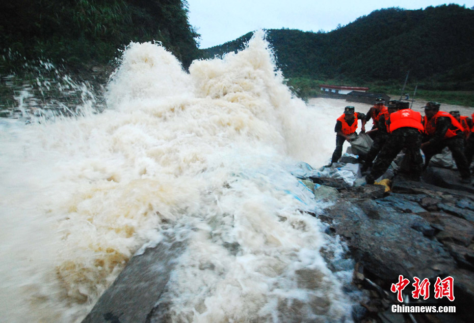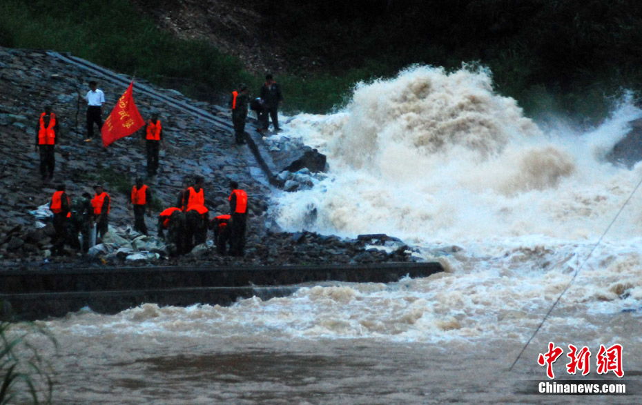 中新网都昌7月14日电(胡国林)14日,受强降雨袭击,江西九江市都昌大港镇梅溪水库水位超过泄洪道1米左右,启闭设备出现失灵,洪水如猛兽般狂泻入下,部分村庄和数千亩农田被淹。 险情发生后,当地防汛部门立即组织抗洪抢险突击队,武警官兵和当地群众冒着生命危险,抛石加固堤坝,防止洪库溃堤,下游数千名村民已被安全转移。