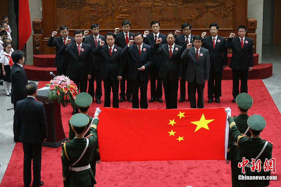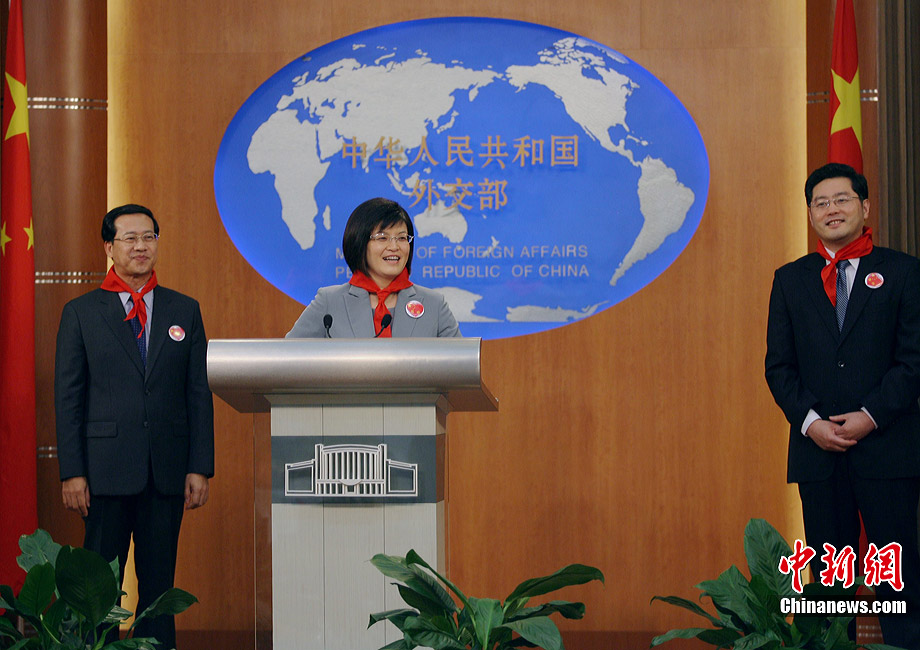 7月17日,在外交部橄榄厅,外交部长杨洁篪勉励玉树震区小学生努力学习、重建家园。当日,外交部举办第八次驻外使节任职宣誓仪式暨外交部“祖国在我心中”主题公众开放日。来自北京、玉树、黑龙江、重庆等地的小学生参加了此次活动。中新社发 苏丹 摄