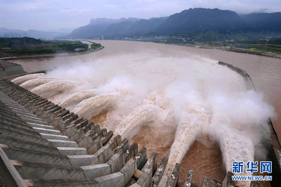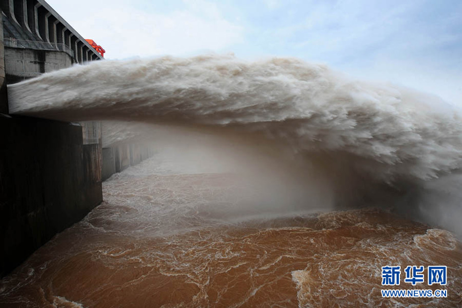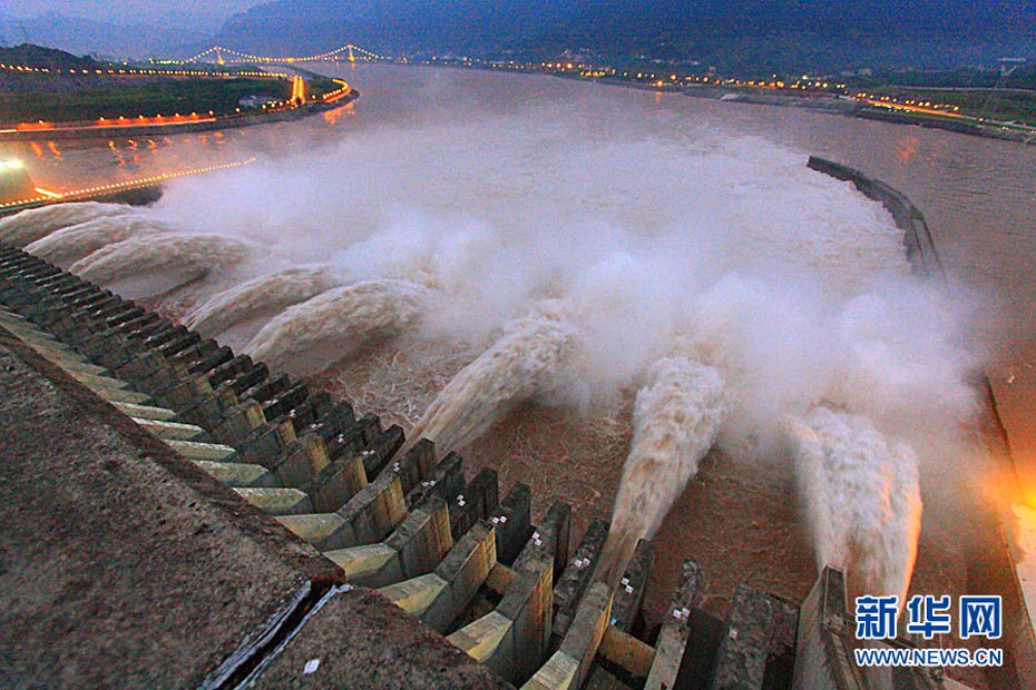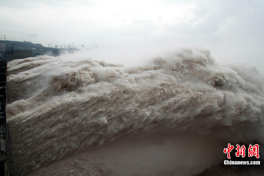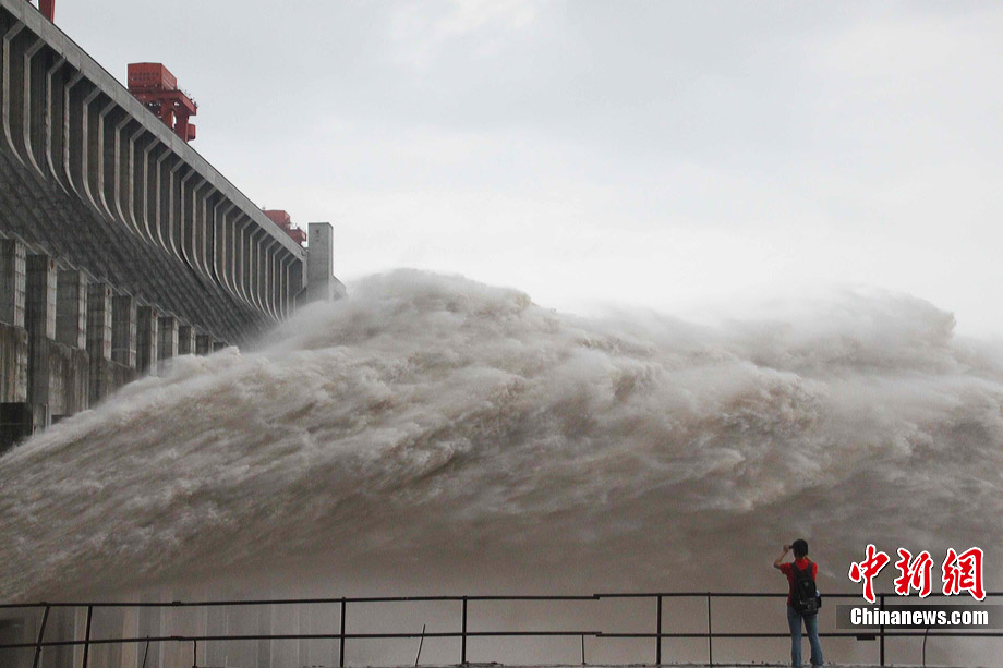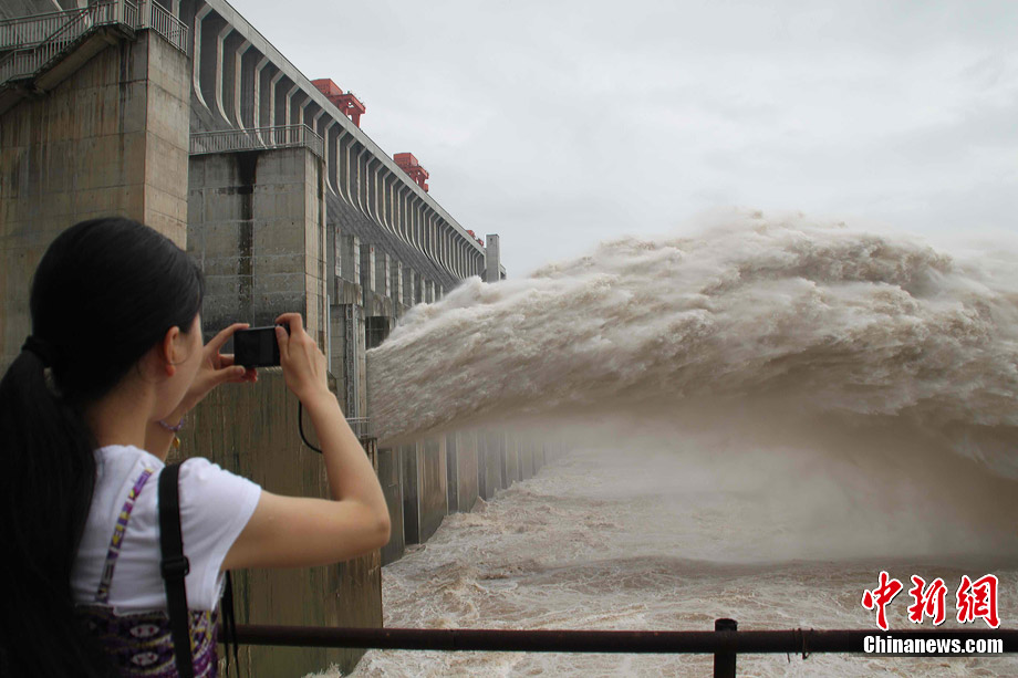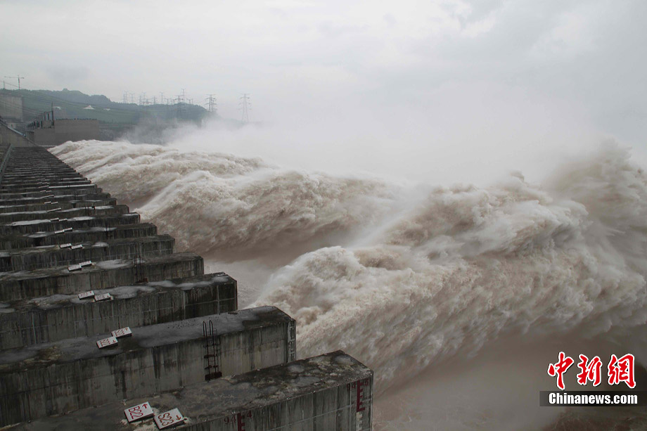 7月20日8时,峰值为7万立方米/秒的洪水抵达三峡大坝。这是三峡工程建成后的首次大规模洪峰。大坝共开启9个泄洪深孔,将洪水下泄流量控制在4万立方米/秒左右,削减了4成多的洪峰下泄流量。中新社发 刘良伟 摄