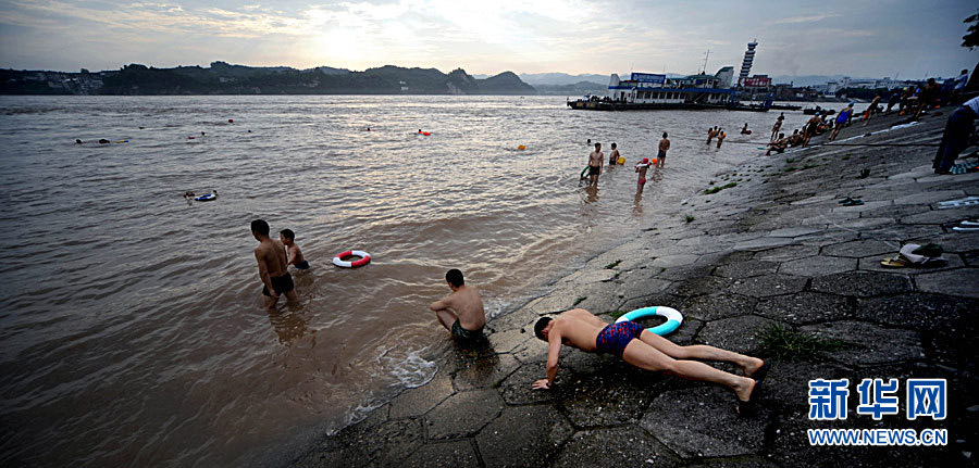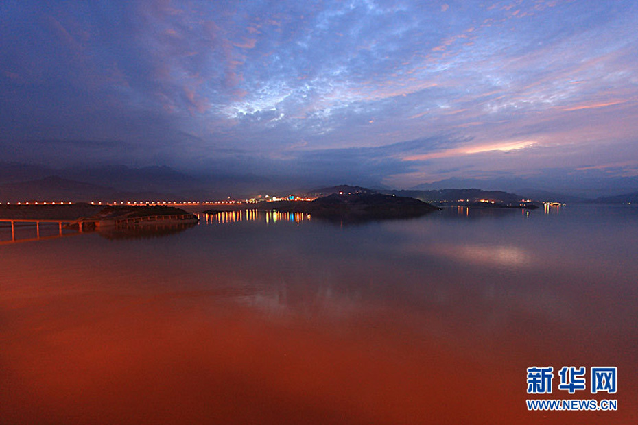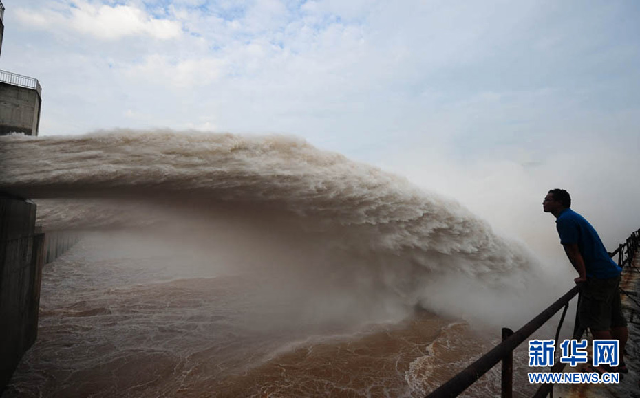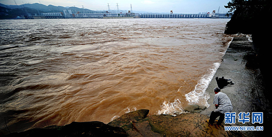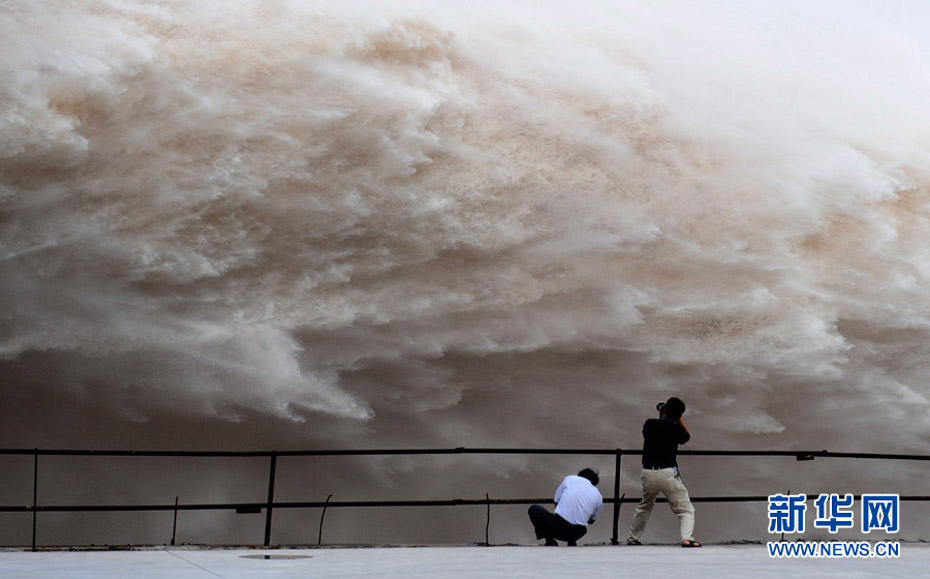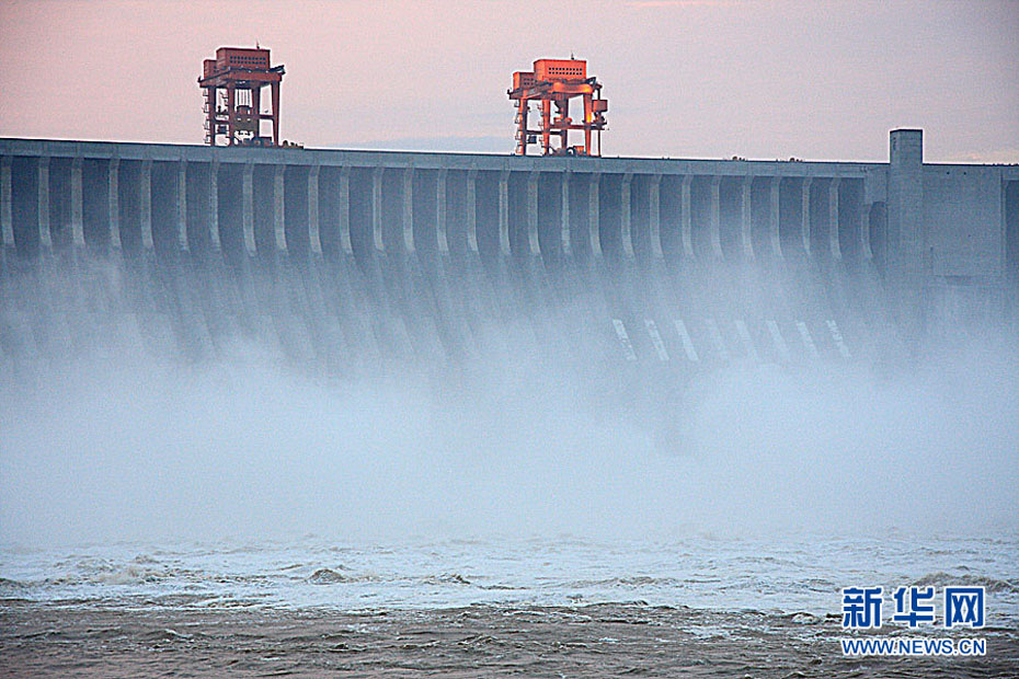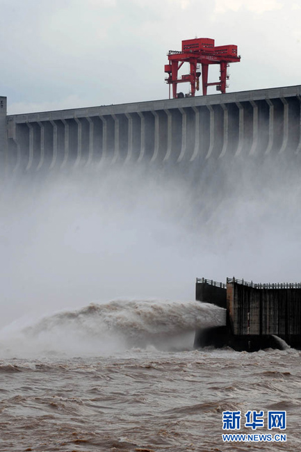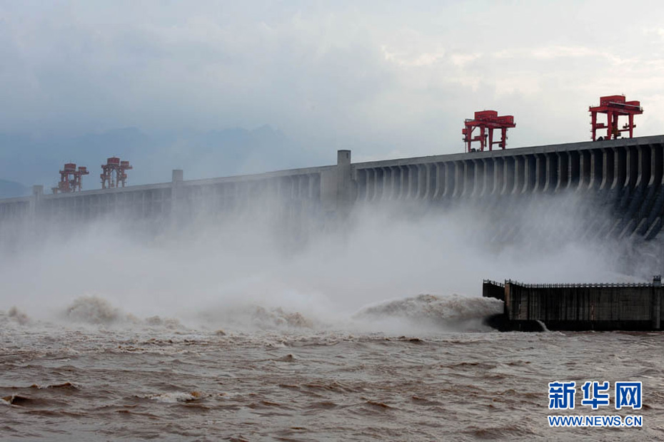 7月20日8时,峰值为7万立方米/秒的洪水抵达三峡大坝。这是三峡工程建成后的首次大规模洪峰。大坝共开启9个泄洪深孔,将洪水下泄流量控制在4万立方米/秒左右,削减了4成多的洪峰下泄流量。中新社发 刘良伟 摄