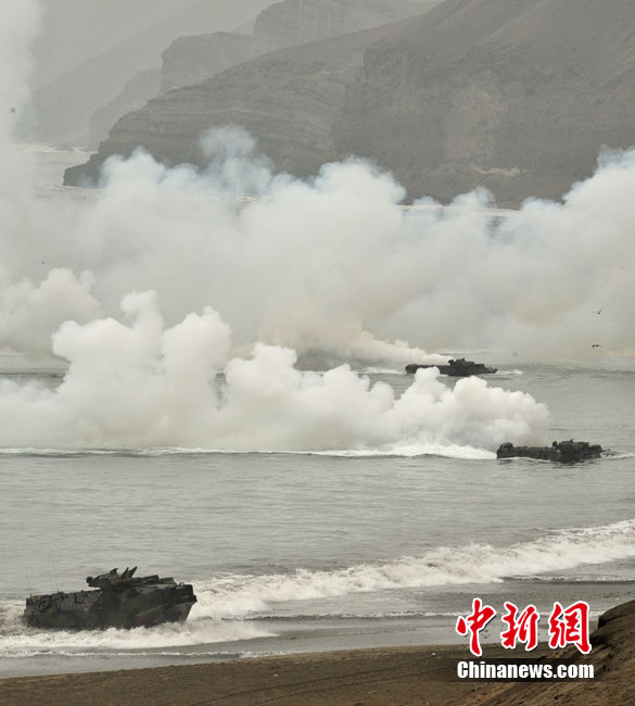 7月19日,美国与秘鲁、阿根廷、巴西、哥伦比亚、墨西哥和乌拉圭等10国海军一起在秘鲁首都利马北部的安孔港展开一场代号为“SE/POA 10”的联合两栖登陆演习。