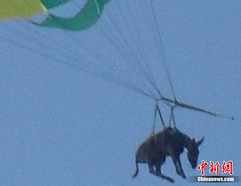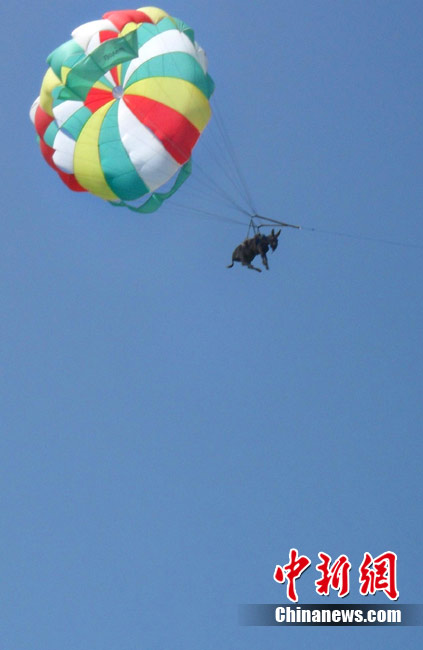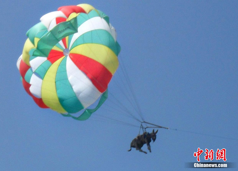 俄罗斯警方于20日表示,上周在俄罗斯东部亚速海岸,游客及当地民众从湛蓝的天空中看到了惊人的一幕:一头身上绑着降落伞的毛驴正在天上绕着圈圈。 据称,当时这头毛驴因为惊恐,而破嗓大叫。