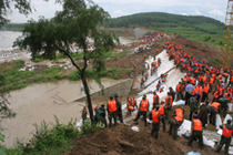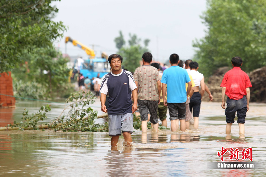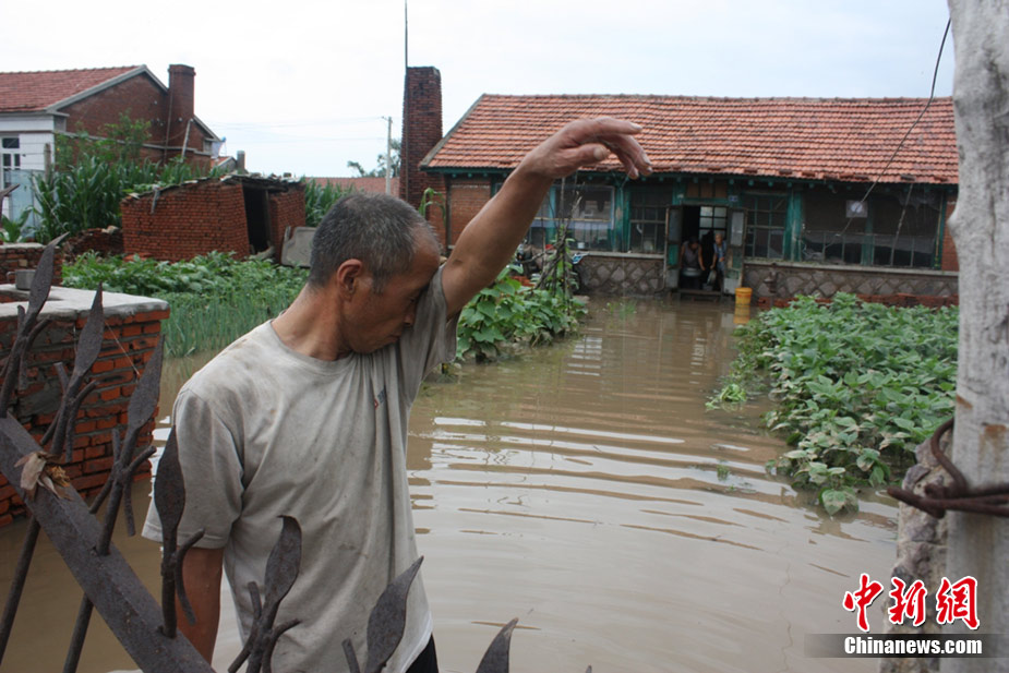7月21日4时30分左右,辽宁省铁岭县境内胜利河阿吉段决口,决口宽度20米,流量600立方米/秒,淹没耕地5000亩,当地驻军、公安干警、民兵预备役400多人投入抗洪抢险,转移群众3000多人。此前该地区连降暴雨,平均降雨362毫米。图为阿吉村民金福祥看着自己家被淹没非常伤心。中新社发 秦逸 摄