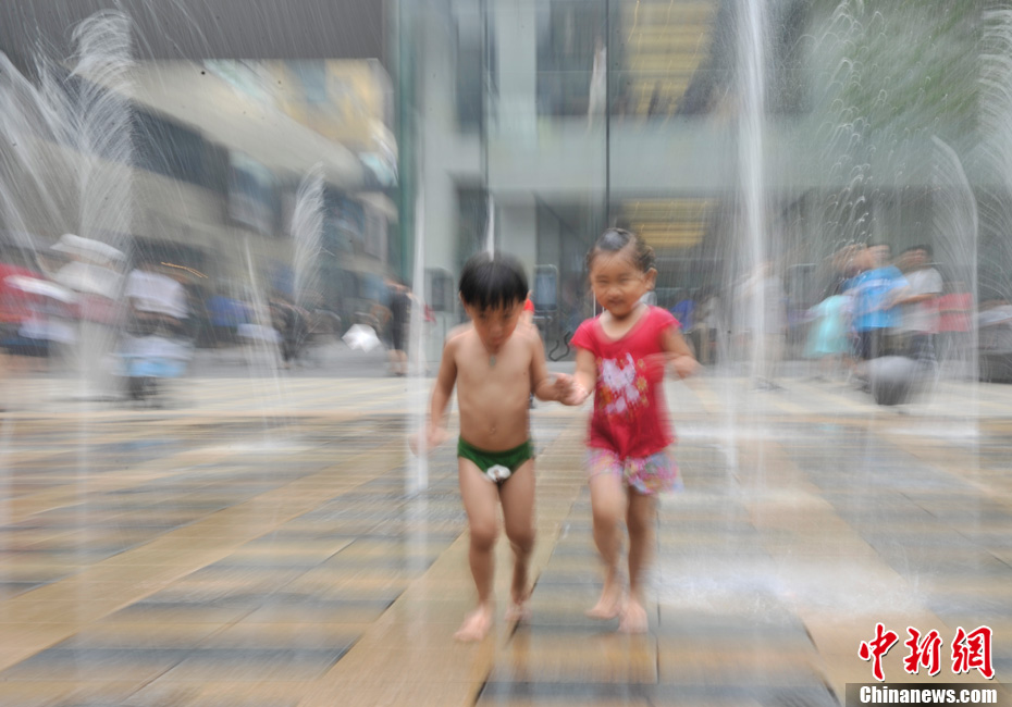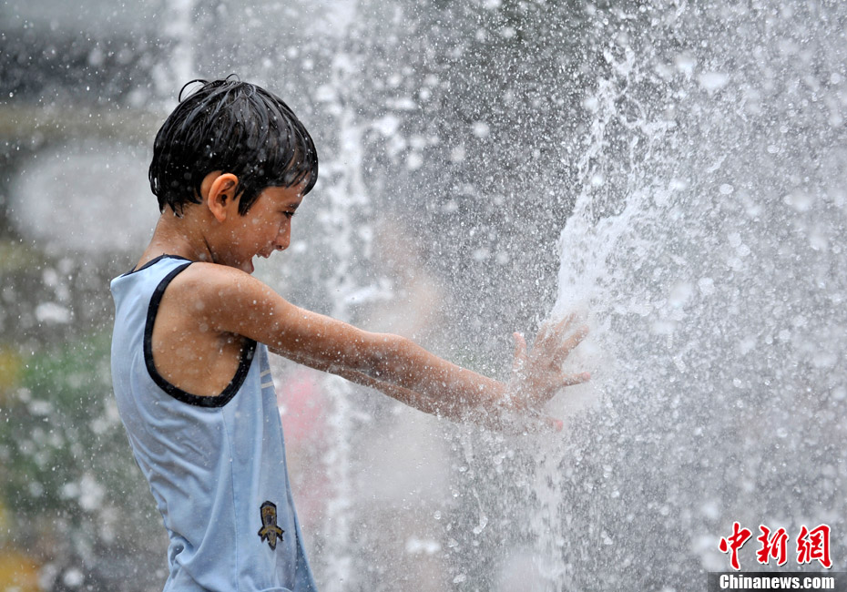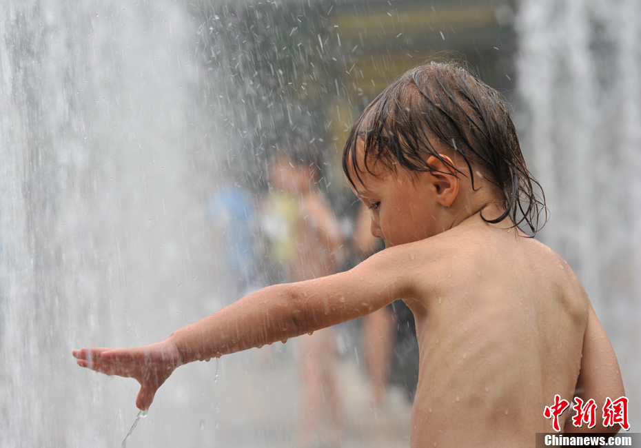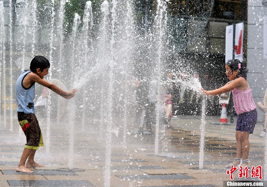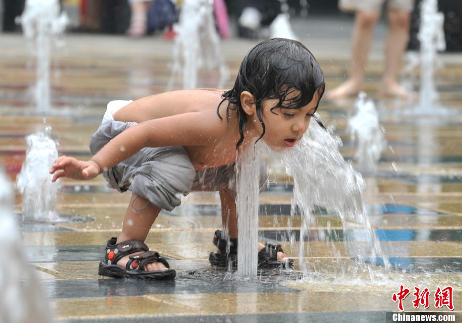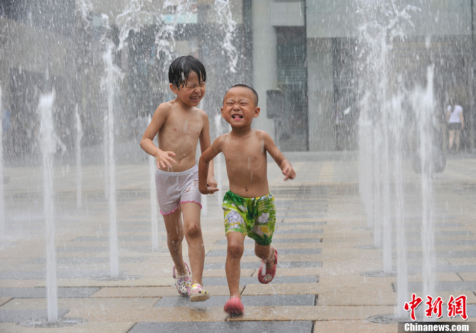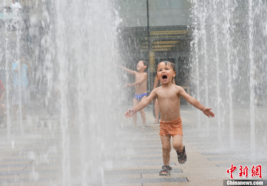 近日,北京持续的高温使“桑拿天”的感觉越来越强烈。中央气象台继续发布高温蓝色预警,预计未来三天,新疆吐鲁番盆地和南疆盆地、甘肃西部、内蒙古大部有35-37℃的高温天气,新疆吐鲁番盆地、内蒙古中西部的部分地区最高气温可达42℃以上;陕西东北部、山西北部、河北中西部、北京大部、天津西部、重庆大部、江南中西部等地有35℃以上的高温天气,局地最高气温可达37~38℃。图为7月26日北京三里屯一处喷泉引来许多中外小朋友戏水享清凉。中新网记者 金硕 摄