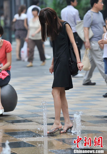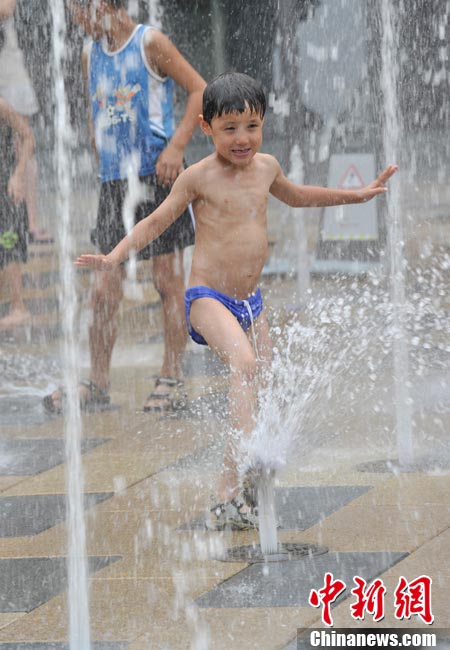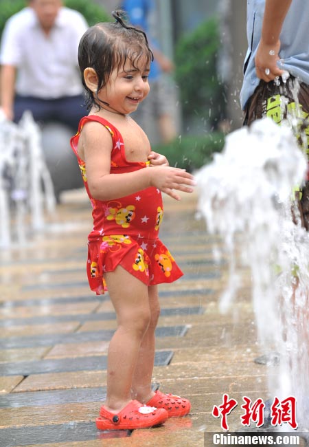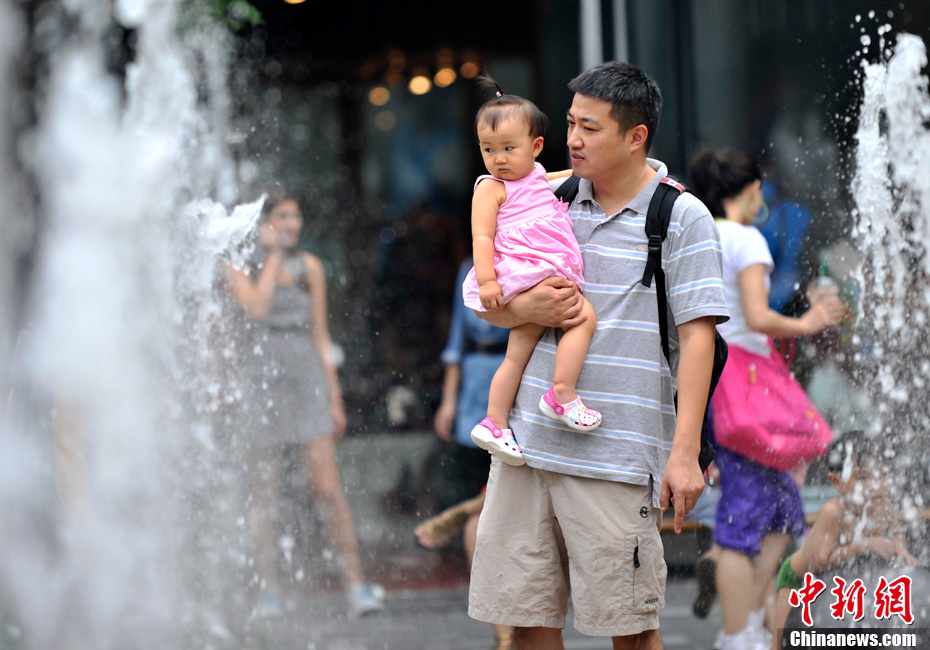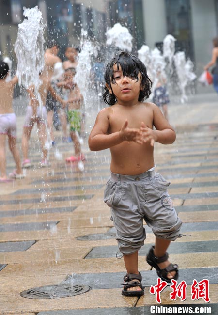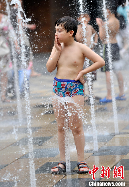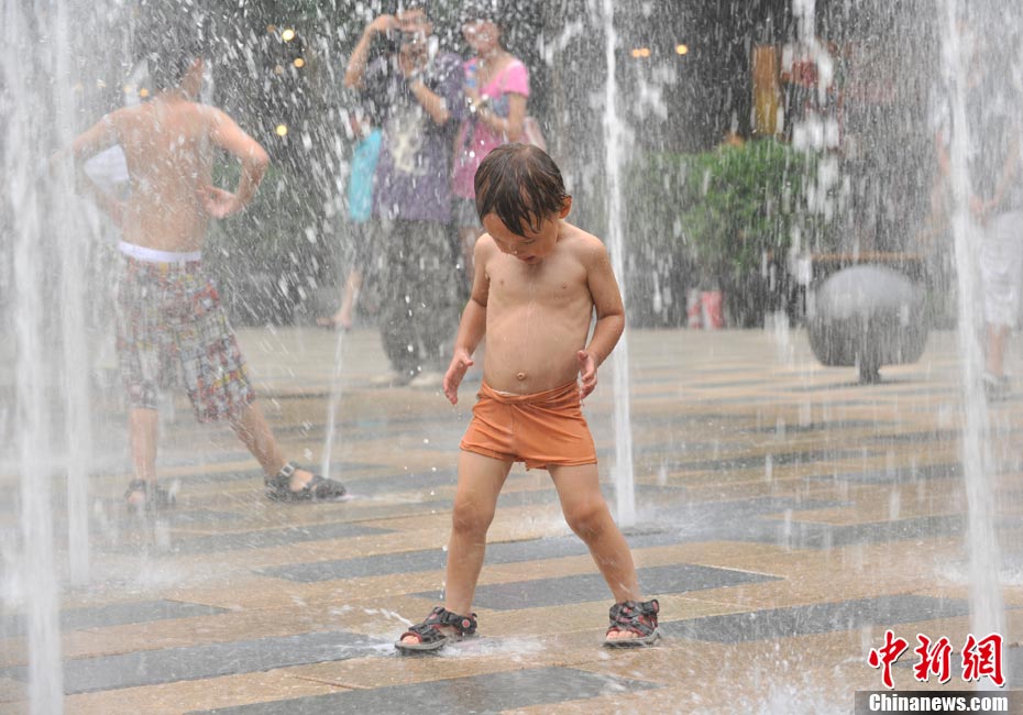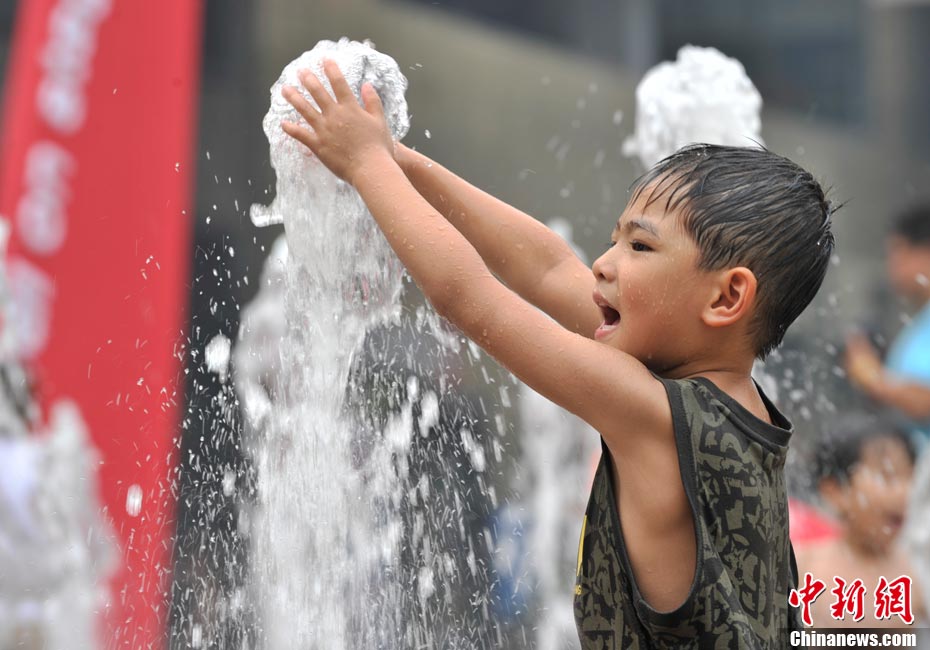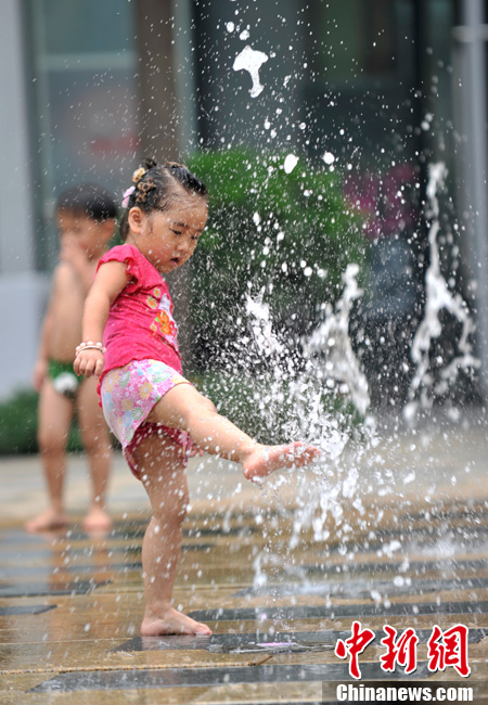 近日,北京持续的高温使“桑拿天”的感觉越来越强烈。中央气象台继续发布高温蓝色预警,预计未来三天,新疆吐鲁番盆地和南疆盆地、甘肃西部、内蒙古大部有35-37℃的高温天气,新疆吐鲁番盆地、内蒙古中西部的部分地区最高气温可达42℃以上;陕西东北部、山西北部、河北中西部、北京大部、天津西部、重庆大部、江南中西部等地有35℃以上的高温天气,局地最高气温可达37~38℃。图为7月26日北京三里屯一处喷泉引来许多中外小朋友戏水享清凉。中新网记者 金硕 摄