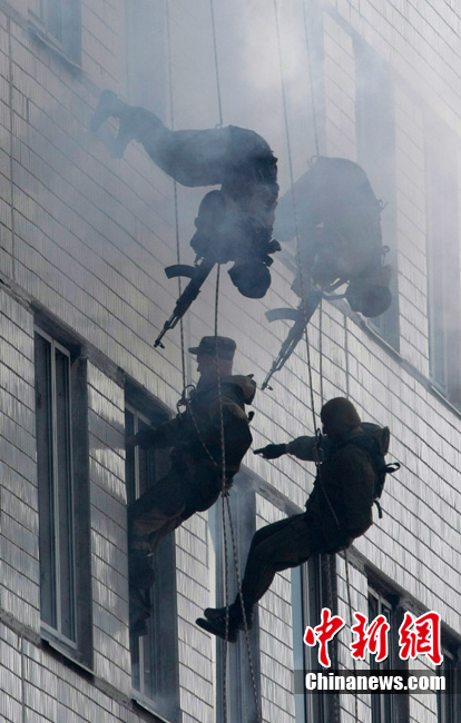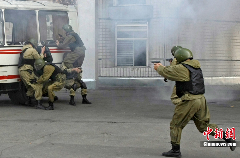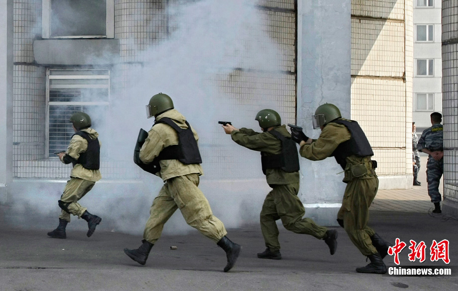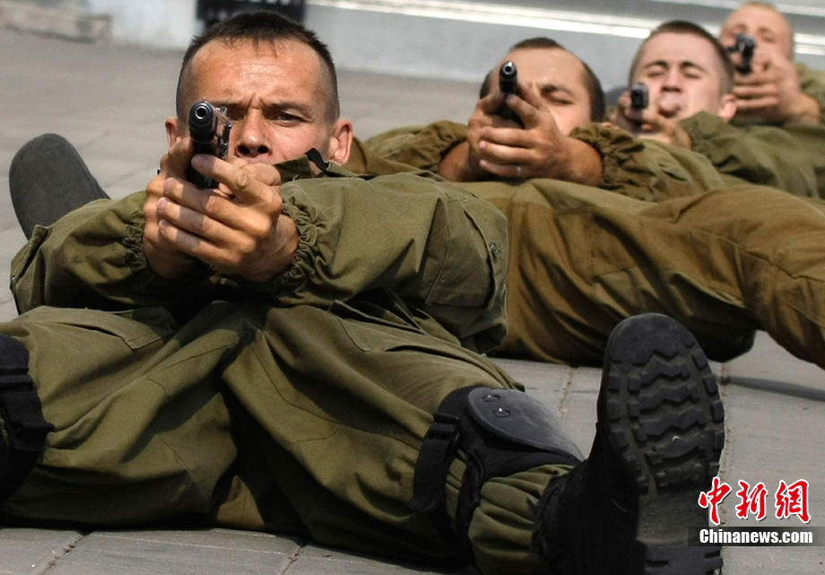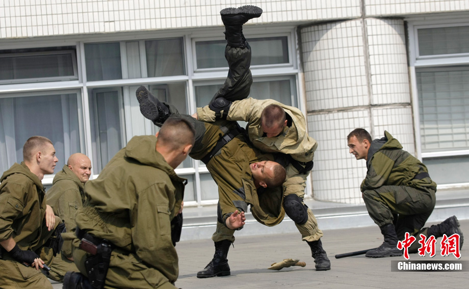 当地时间7月28日,俄罗斯特别部队(内务部特种部队)士兵在莫斯科郊区公开展示了其训练成果和战斗技能。